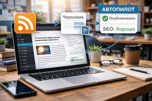RSS → генерация → очередь → SEO → публикация → комментарии. Пилотное подключение вручную.
